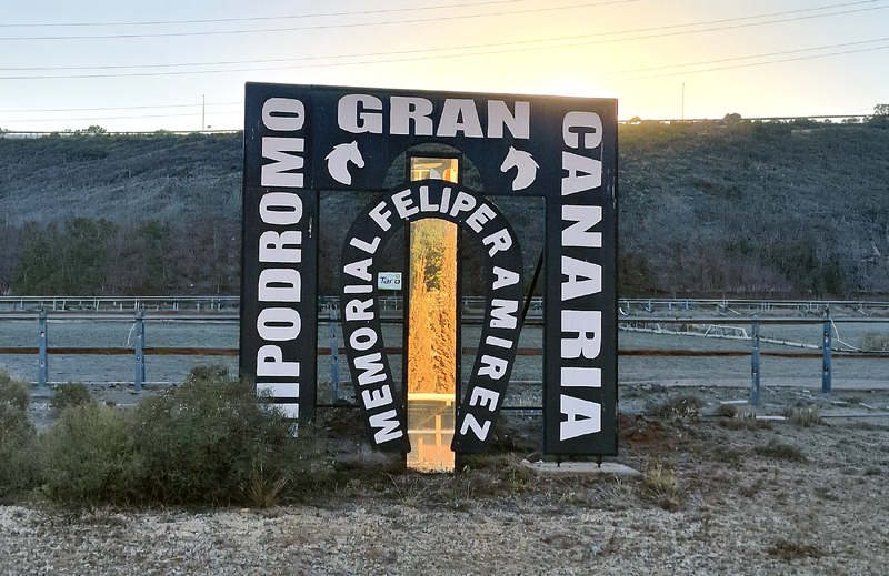 <p data-end="227" data-start="95">R&oacute;tulo monumental del <em>Hip&oacute;dromo Gran Canaria</em>,&nbsp;situado en el interior de sus instalaciones, concebido como hito identificativo.&nbsp;La estructura adopta un esquema rectangular vertical que articula en un solo conjunto la denominaci&oacute;n&nbsp;oficial, que enmarca un vano central en el que se integra una gran herradura en la que se mostraba el evento o carrera a celebrar. El&nbsp;&nbsp;<em>Memorial Felipe Ram&iacute;rez,</em> ha quedado como recuerdo de la &uacute;ltima prueba o carrera celebrada.<em>&nbsp;</em>El contraste crom&aacute;tico blanco sobre fondo negro y la tipograf&iacute;a de gran cuerpo garantizan su legibilidad a distancia, funcionando como hito paisaj&iacute;stico visible desde cualquier punto del recinto deportivo.</p>
