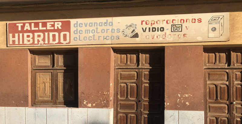 <p>R&oacute;tulo artesanal pintado a mano correspondiente al <em>Taller H&iacute;brido</em>, especializado en devanado de motores el&eacute;ctricos y reparaci&oacute;n de peque&ntilde;os electrodom&eacute;sticos. Ejemplo significativo del paisaje comercial tradicional de Vecindario en el &uacute;ltimo tercio del siglo XX.</p> <p>El r&oacute;tulo anuncia el servicio de devanado de motores el&eacute;ctricos, actividad t&eacute;cnica que consist&iacute;a en rebobinar manualmente motores averiados para prolongar su vida &uacute;til. Este oficio, fundamental en &eacute;pocas donde la reparaci&oacute;n prevalec&iacute;a sobre la sustituci&oacute;n, ha ido desapareciendo con la estandarizaci&oacute;n industrial y el abaratamiento de los aparatos nuevos. Tambi&eacute;n indica la reparaci&oacute;n de video, TV y lavadoras, lo que sit&uacute;a el negocio en un momento de expansi&oacute;n del consumo dom&eacute;stico, probablemente entre las d&eacute;cadas de 1970 y 1990, cuando los talleres locales eran el soporte t&eacute;cnico del barrio.&nbsp;El error en el uso de la palabra &ldquo;vidio&rdquo; en lugar de &ldquo;v&iacute;deo&rdquo;, lejos de restarle valor, refuerza su car&aacute;cter artesanal y espont&aacute;neo.&nbsp;</p> <p>El t&eacute;rmino &ldquo;h&iacute;brido&rdquo; no alude aqu&iacute; a tecnolog&iacute;a automotriz contempor&aacute;nea, sino que funciona como denominaci&oacute;n comercial singular, posiblemente vinculada a la combinaci&oacute;n de servicios el&eacute;ctricos y electr&oacute;nicos. Este tipo de establecimiento fue clave en el desarrollo urbano de Vecindario durante su crecimiento demogr&aacute;fico, ofreciendo soluciones t&eacute;cnicas accesibles a la poblaci&oacute;n trabajadora del municipio.</p>