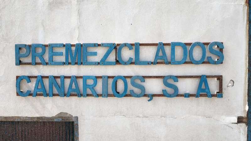 <p>Rótulo de la empresa <em>Premezclados Canarios,</em> formado por letras recortadas en chapa metálica, atornilladas individualmente a dos largueros horizontales de hierro. El cromatismo azul intenso contrasta con el fondo claro del paramento, favoreciendo la visibilidad a distancia. La tipografía, de palo seco y trazo contundente, es propia del lenguaje gráfico industrial de las décadas finales del siglo XX. Constituye un vestigio físico de esa etapa industrial, vinculado a la memoria económica del entorno de Pozo Izquierdo y a la expansión constructiva de finales del siglo pasado en Canarias.</p>