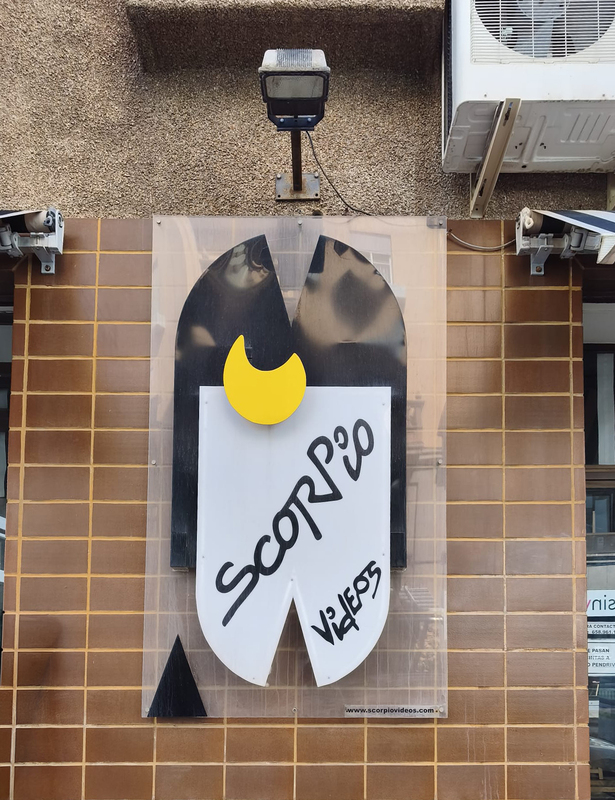 <p>R&oacute;tulo identificativo del hist&oacute;rico <strong>Scorpio V&iacute;deos</strong>, &uacute;ltimo videoclub en activo de Santa Cruz de Tenerife, asociado a la memoria reciente del consumo cinematogr&aacute;fico dom&eacute;stico y uno de los &uacute;ltimos vestigios materiales de la cultura del videoclub en Canarias. De est&eacute;tica postmoderna y composici&oacute;n abstracta, destaca por su singularidad formal: una estructura vertical de planos superpuestos en metacrilato y materiales sint&eacute;ticos, donde una tipograf&iacute;a manuscrita se integra en una composici&oacute;n simb&oacute;lica que recuerda, de forma sugerida, a un rollo de pel&iacute;cula o a un dispositivo de reproducci&oacute;n.&nbsp;</p>