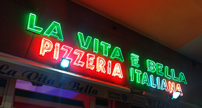 <p style="line-height:1.38"><span style="font-size:11pt; font-variant:normal; white-space:pre-wrap"><span style="font-family:Arial,sans-serif"><span style="color:#000000"><span style="font-weight:400"><span style="font-style:normal"><span style="text-decoration:none">La Pizzer&iacute;a La Vita &Egrave; Bella fue fundada por <strong>Giovanni Paratore</strong>, originario de Sicilia (Italia). Giovanni lleg&oacute; a Canarias alrededor de 1999 y, tras unos a&ntilde;os en la isla, decidi&oacute; abrir su propio restaurante a comienzos de los a&ntilde;os 2000, </span></span></span></span></span></span><span style="font-size:11pt; font-variant:normal; white-space:pre-wrap"><span style="font-family:Arial,sans-serif"><span style="color:#000000"><span style="font-weight:400"><span style="font-style:normal"><span style="text-decoration:none">participando activamente en la construcci&oacute;n y decoraci&oacute;n del local. En los primeros tiempos el local a&uacute;n no ten&iacute;a luz ni agua, por lo que muchas jornadas de trabajo se realizaban desde la ma&ntilde;ana hasta que anochec&iacute;a.</span></span></span></span></span></span></p> <p><span style="font-size:11pt; font-variant:normal; white-space:pre-wrap"><span style="font-family:Arial,sans-serif"><span style="color:#000000"><span style="font-weight:400"><span style="font-style:normal"><span style="text-decoration:none">La pizzer&iacute;a naci&oacute; con la intenci&oacute;n de ofrecer pizza italiana aut&eacute;ntica, manteniendo la tradici&oacute;n de su lugar de origen y utilizando productos locales de kil&oacute;metro cero. </span></span></span></span></span></span><span style="font-size:11pt; font-variant:normal; white-space:pre-wrap"><span style="font-family:Arial,sans-serif"><span style="color:#000000"><span style="font-weight:400"><span style="font-style:normal"><span style="text-decoration:none">Uno de los elementos m&aacute;s caracter&iacute;sticos del restaurante es su letrero de ne&oacute;n con los colores de la bandera italiana, que se ha convertido en un elemento distintivo del local y en un ejemplo de supervivencia de un tipo de r&oacute;tulo hoy casi desaparecido.</span></span></span></span></span></span></p> <p>&nbsp;</p>